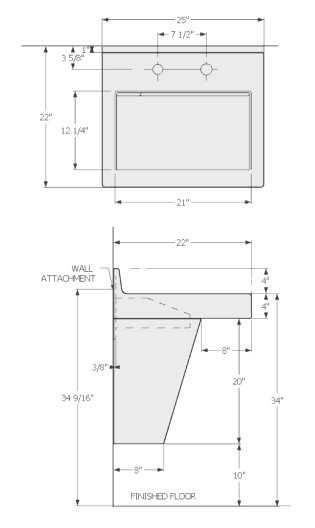 - 22” D x 25” W x 28” H with 4” molded integral backsplash
